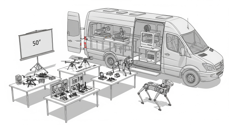 FabMobile није само комби. То је покретни FabLab – натрпан 3D штампачима, роботима, VR/AR технологијом, дроновима и још много тога. Направљен да руши баријере и доноси технологију директно у школе, стартапове, пословне зоне, сајмове и заједнице широм Босне и Херцеговине.